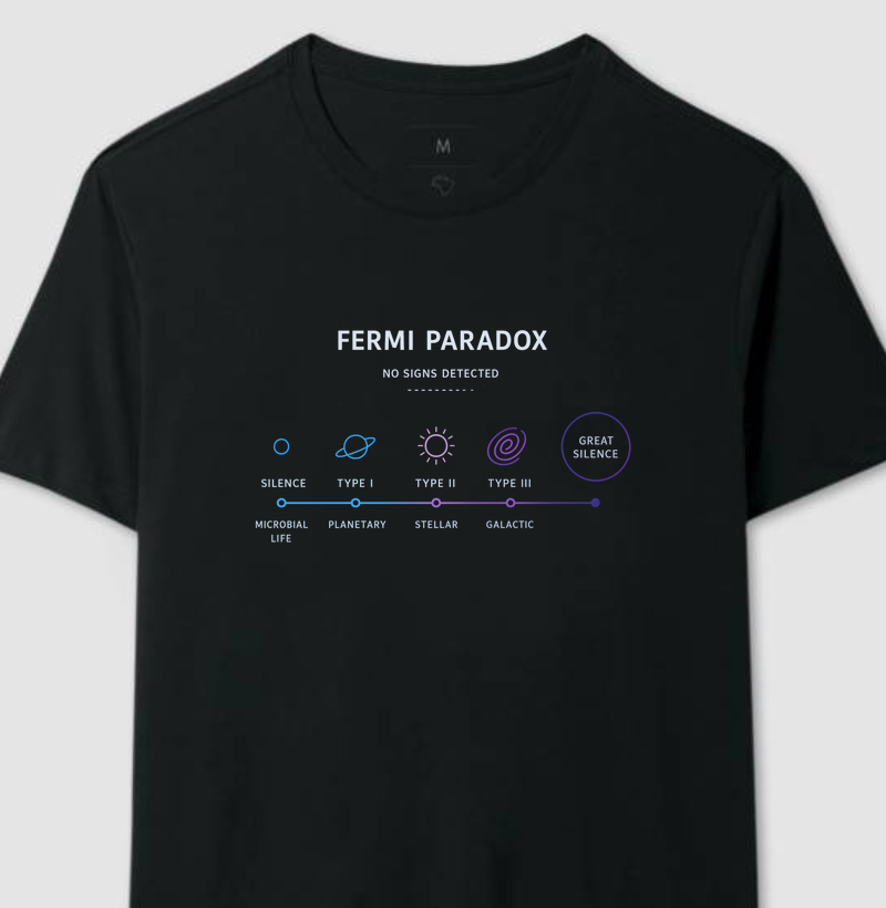 Cosmic Silence – Kardashev & Fermi Mergulhe no mistério do universo com a Camiseta Cosmic Silence, uma peça exclusiva da Artemis Wear. Inspirada na Escala de Kardashev e no Paradoxo de Fermi, esta estampa traduz a fascinante pergunta: “Se o universo é tão vasto e antigo… onde estão todos?” A arte mostra, de forma visual e impactante, a evolução das civilizações — do surgimento da vida microbiana até o domínio galáctico — e destaca o intrigante “Grande Silêncio Cósmico”, onde deveríamos encontrar sinais de vida, mas não encontramos. Perfeita para amantes da astronomia, astrofotografia e ficção científica, a camiseta une conhecimento, estilo e paixão pelo cosmos. Destaques do Produto Estampa exclusiva Artemis Wear. Design futurista e conceitual. Ideal para curiosos do universo e caçadores de respostas. Tecido 100% algodão premium. Impressão digital de alta definição. Corte confortável e acabamento impecável.