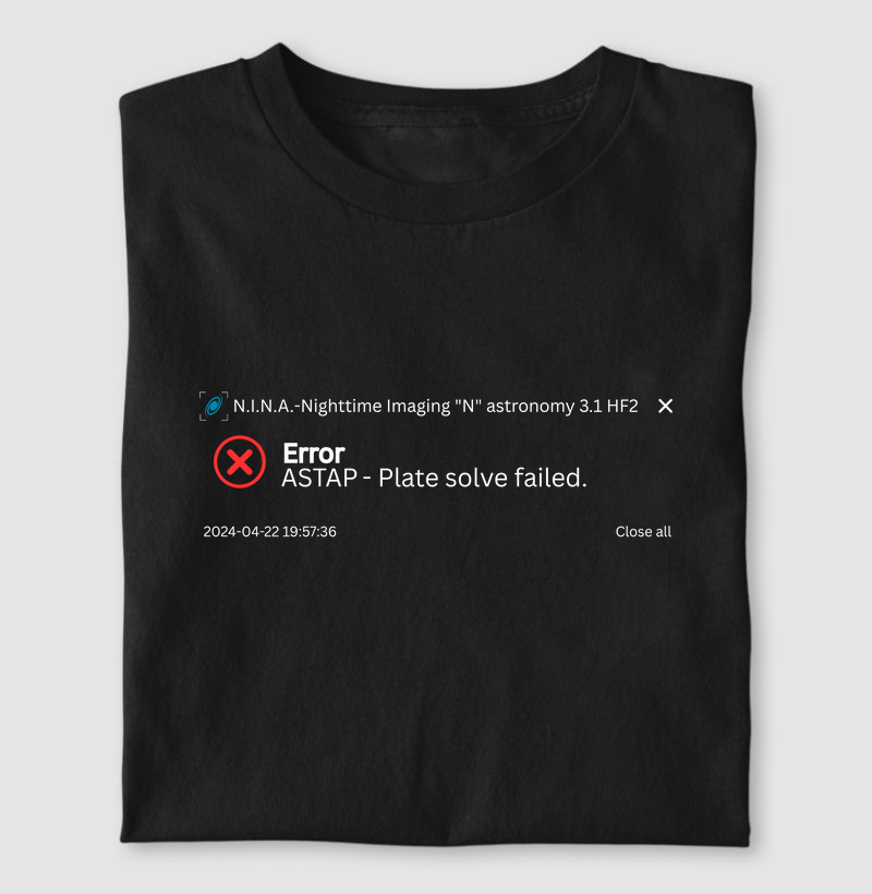 Camiseta “Error ASTAP – Plate Solve Failed” Quando o N.I.N.A. te diz que não conseguiu fazer o plate solve, mas você não desiste do céu! Essa camiseta foi criada para os guerreiros da astrofotografia que sabem o que é lutar contra o tempo, a poluição luminosa, as nuvens e… os erros do ASTAP! Confeccionada em algodão premium, com estampa de alta definição e toque suave, ela é perfeita para usar nas noites de captura ou para mostrar ao mundo que você faz parte do time que não aceita "Failed" como resposta. 🔹 Material: 100% algodão penteado 🔹 Estilo: Unissex, modelagem confortável 🔹 Estampa: Durável, não desbota 🔹 Tema: Astronomia, astrofotografia, bom humor 🔹 Perfeita para: Observações, encontros astronômicos e lives de captura Mostre que até os melhores astrofotógrafos enfrentam erros, mas o amor pelo universo sempre vence.