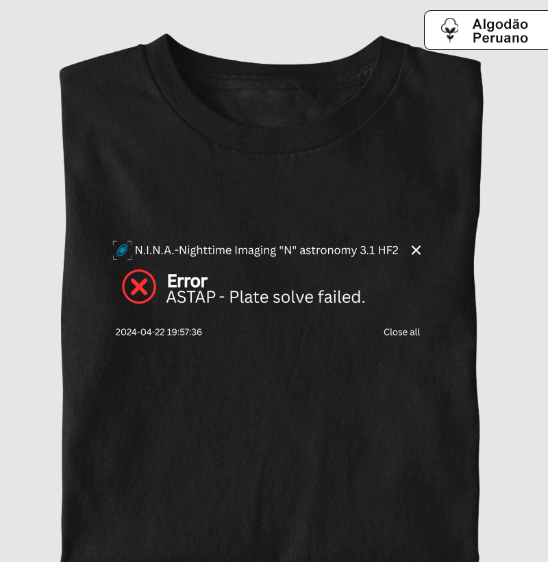 Camiseta “Error ASTAP – Plate Solve Failed” Quando o N.I.N.A. te diz que não conseguiu fazer o plate solve, mas você não desiste do céu! Essa camiseta foi criada para os guerreiros da astrofotografia que sabem o que é lutar contra o tempo, a poluição luminosa, as nuvens e… os erros do ASTAP! Confeccionada em algodão premium, com estampa de alta definição e toque suave, ela é perfeita para usar nas noites de captura ou para mostrar ao mundo que você faz parte do time que não aceita "Failed" como resposta. 🔹 Material: 100% algodão penteado 🔹 Estilo: Unissex, modelagem confortável 🔹 Estampa: Durável, não desbota 🔹 Tema: Astronomia, astrofotografia, bom humor 🔹 Perfeita para: Observações, encontros astronômicos e lives de captura Mostre que até os melhores astrofotógrafos enfrentam erros, mas o amor pelo universo sempre vence.