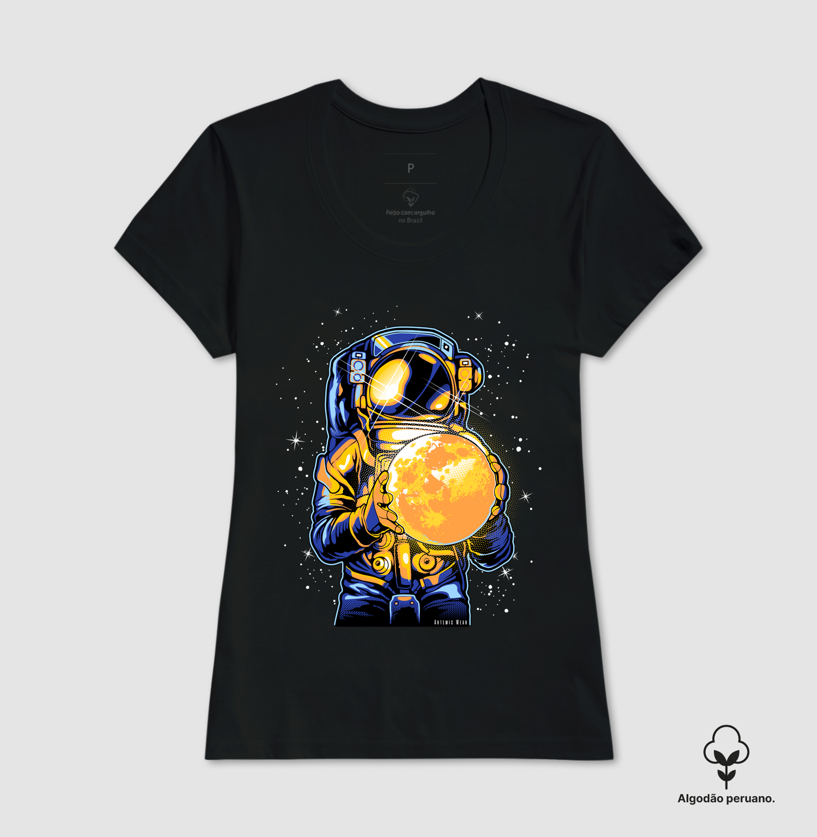 "Segure o impossível." Um astronauta flutua no silêncio do universo, segurando a Lua como quem segura um sonho. Porque pra quem ousa ir além, até os astros cabem na palma da mão. Vista o infinito — conquiste o inalcançável.