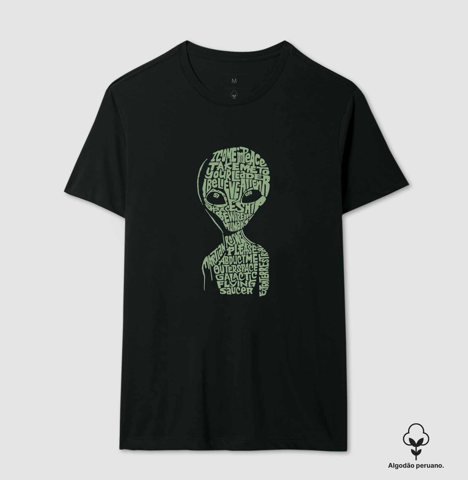 Camiseta Alien Tipográfica – Eu Acredito! Se você é apaixonado por mistérios do universo, ufologia e vida extraterrestre, essa camiseta foi feita para você! O design forma o rosto de um alienígena utilizando palavras icônicas como "I come in peace", "Take me to your leader", "Roswell", "Flying Saucer" e muito mais. ✔ Estampa criativa e cheia de estilo ✔ Ideal para quem curte astronomia, ficção científica e cultura pop alienígena ✔ Conforto e qualidade para usar no dia a dia Uma peça que conecta moda e universo, perfeita para mostrar que você também acredita no desconhecido!